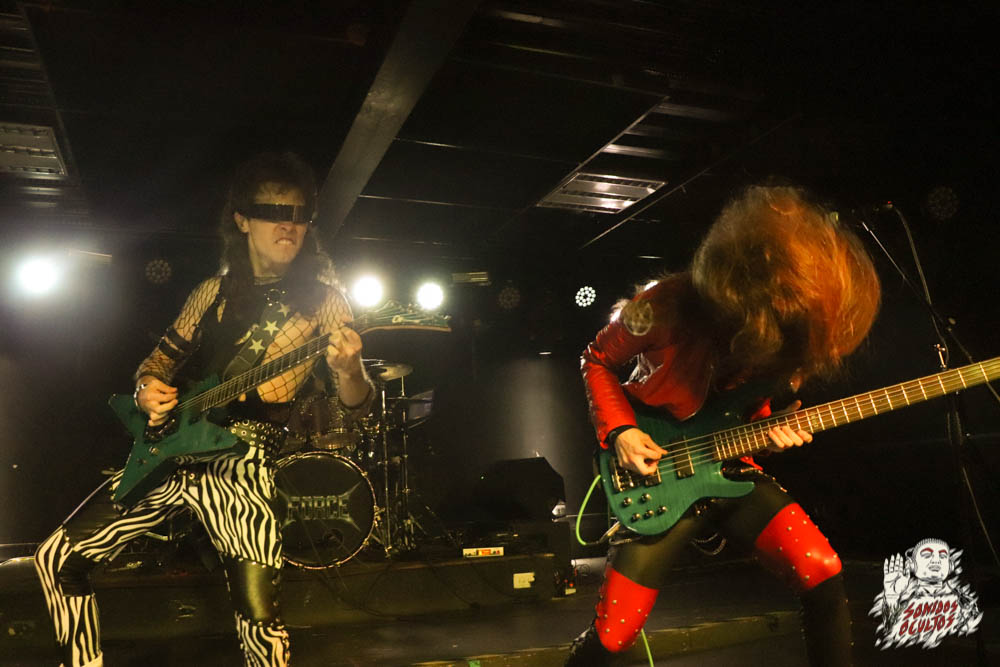Hans Beyer, a las cuatro cuerdas, tuvo la doble tarea de moldear la velocidad de Laureano, una guitarra danzarina que no se queda pegada en power chords ni en ráfagas palmuteadas; los hace, pero planeando entre la cadencia frenética del solo, y la precisión de la rítmica, como pudimos oír en «Speed», una canción colérica, cañera y cogotera, por la guitarra punzante, por la percusión sólida, y por tener pura vocación de asalto y estampida.