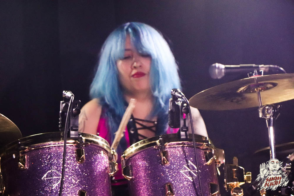 «Power of Rock», por ejemplo, fue un momento álgido en el que se apreció la fuerte pegada de Sulwacker, con un control y un pulso firme, sin dejar espacios vacíos ni yéndose por delante con la aceleración que pide cada tema; así tocó ella, ni reconcentrada ni colérica, ni rígida ni elástica, Camila es una baterista equilibrada, que pasa sin problemas de la doble pedalera, y del ride al hi-hat, concentrando el groove en la caja y aplicando rápidas variaciones entre los toms, provocando esa sensación de que fuera arriba de la batería como sobre una trotadora del ritmo, creando un excelente tándem junto a Hans.