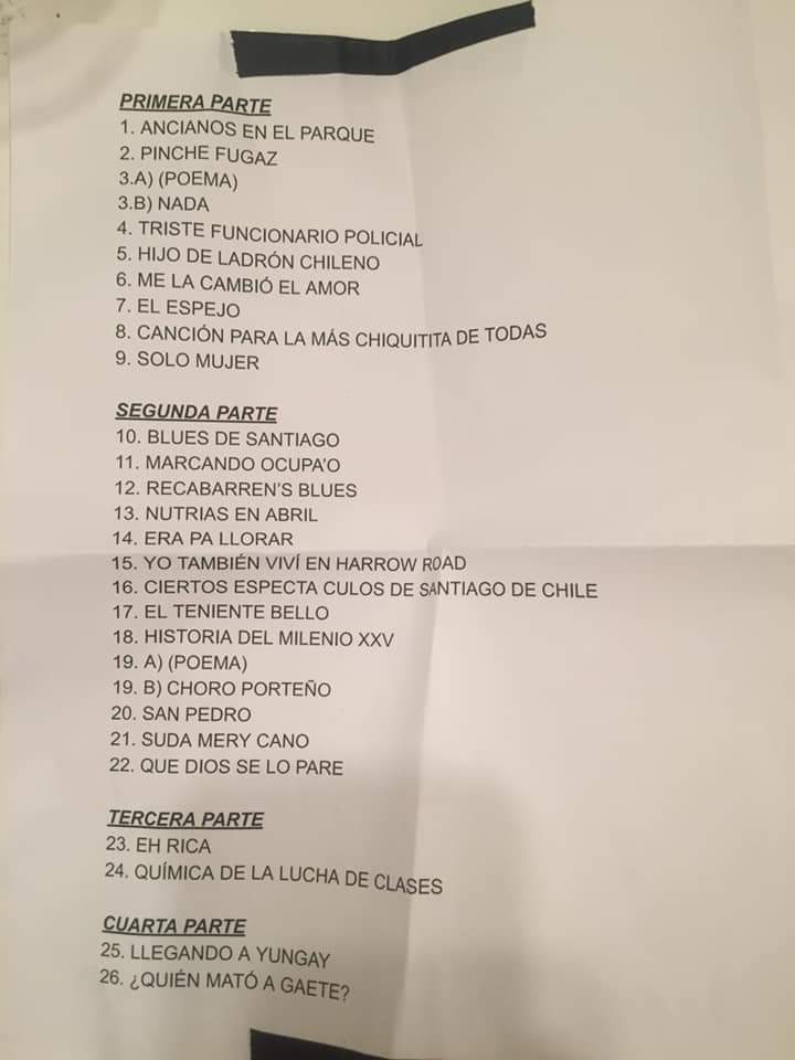 “Química (de la Lucha de Clases)” había sido pedida a los gritos antes y ahora era concedida, con las voces de todo el recinto haciéndolo retumbar como una lata chica de Nescafé. Con todos de pie y bailando en los pasillos, “Llegando a Yungay” y “¿Quién Mató a Gaete?” coronaron este show de 26 canciones, una travesía que abordó de forma magistral el cuerpo creativo de Redolés.